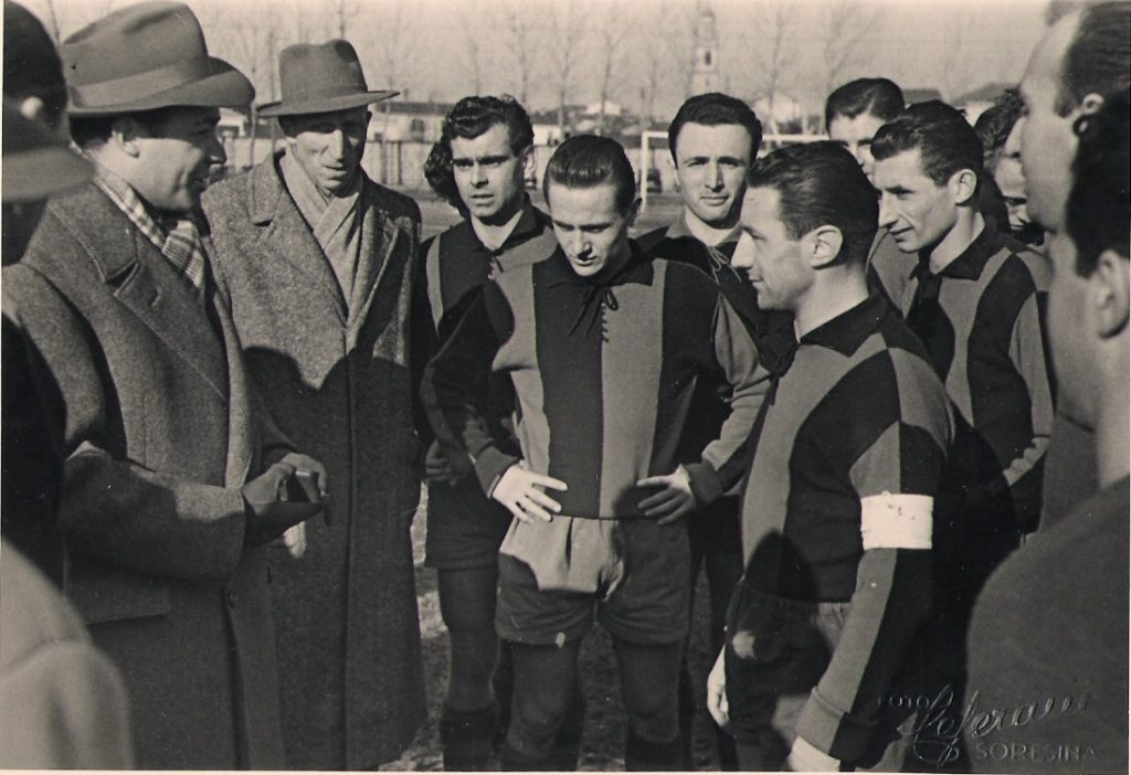 Foto 32 Lucchi Tuelli (Massaggiatore), Menta, Nicolini R., Toscani, Borsotti, Nicolini F., Del Bue (Massaggiatore), Canevari, Pianta, Raccagni V., Triboldi Cav. Pietro (Presidente), Dott. Grassi (Medico), Triboldi Graziano (Consigliere); Spinetta (Dirigente), Cantoni (Allenatore), Bianchessi, Milanesi, Pedroni, Rodini, Degani, Salvetti, Ferrari, Triboldi Secondo (Consigliere), Dragoni (Dirigente), Fiameni (Dirigente).